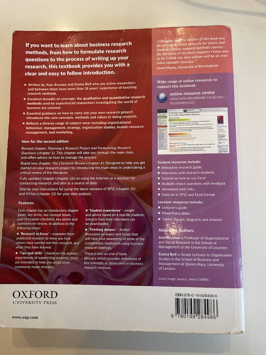 Business Research Methods af Alan Bryman og Emma Bell - 2. udgave (2007) fra Oxford University Press - er en grundig og praktisk guide til virksomhedsforskning for dem, der skal lave et mindre forskningsprojekt eller speciale for første gang. Bogen giver en omfattende introduktion til centrale begreber, metoder og værdier, fra formulering af forskningsspørgsmål og litteraturgennemgang til udformning af spørgeskemaer, dataanalyse og præsentation af resultater. Forfatterne belyser styrker og svagheder ved både kvantitative og kvalitative metoder, så læseren kan vælge den mest hensigtsmæssige tilgang til sit studie. Samtidig diskuteres de filosofiske grundlagsspørgsmål og etiske dilemmaer, der kan opstå undervejs, for at sikre velovervejede forskningsbeslutninger. Bogen kombinerer teoretiske perspektiver med konkrete case-eksempler fra områder som ledelse, strategi og marketing. 2. udgave er desuden opdateret med særlig vægt på internettets voksende rolle som datakilde og forskningsplatform samt den studerendes oplevelse af forskningsprocessen gennem autentiske eksempler fra virkelige projekter.