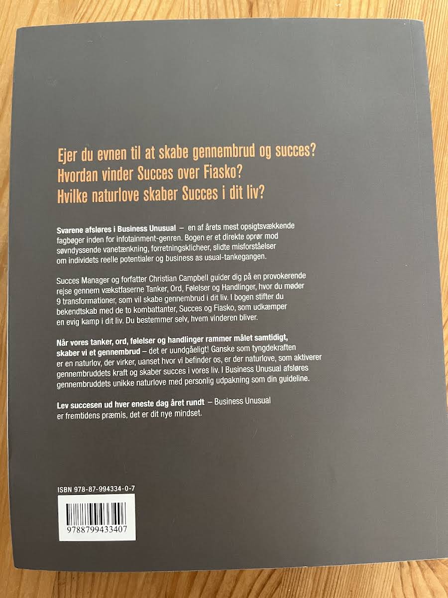 Hvordan succes besejrer fiasko Har du evnen til at skabe gennembrud og opnå succes? Hvordan sejrer succes over fiasko? Hvilke naturlove fremmer succes i dit liv? Svarene afsløres i Business Unusual - en af årets mest bemærkelsesværdige bøger inden for infotainment-genren. Denne bog er en direkte udfordring af kedelig konventionel tænkning, forretningsklichéer, nedslidte misforståelser om individuelt potentiale og "business as usual"-tankegangen.