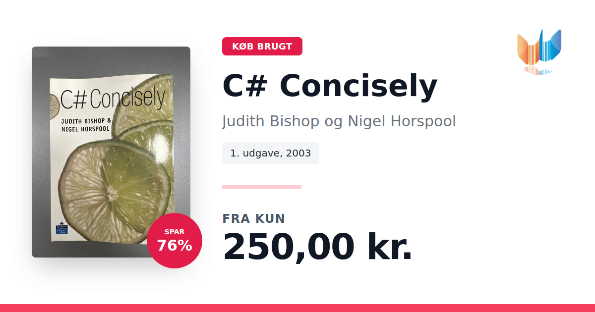 Lige nu kan du købe "C# Concisely" af Judith Bishop og Nigel Horspool til kun 250,00 kr. Du sparer hele 76% af nyprisen! Bogen du ser her er brugt, og i god stand. Vi har i øjeblikket kun et enkelt eksemplar til salg af "C# Concisely", så slå til mens du kan!