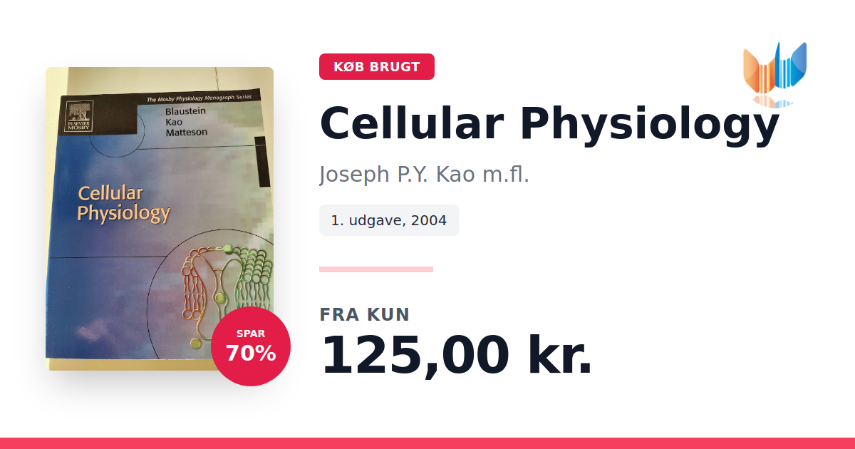 Lige nu kan du købe "Cellular Physiology" af Joseph P.Y. Kao m.fl. til kun 125,00 kr. Du sparer hele 70% af nyprisen! Bogen du ser her er brugt, og i god stand. Vi har i øjeblikket 2 eksemplarer til salg af "Cellular Physiology", så husk at se de forskellige udgaver.