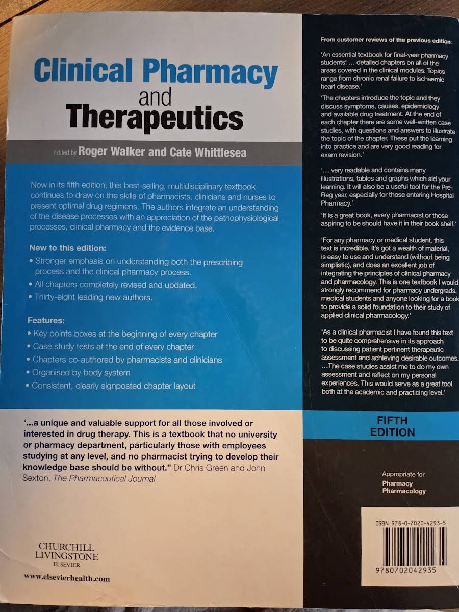 Clinical Pharmacy and Therapeutics af Cate Whittlesea og Roger Walker er en grundigt gennemarbejdet lærebog, udgivet af Elsevier Health Sciences i 2011. Med sine 1000 sider i paperback-format rummer den en omfattende gennemgang af patofysiologi, sygdomsmekanismer og den nyeste evidens for farmakoterapi. Bogen er organiseret efter organsystemer, hvilket skaber en logisk og overskuelig struktur. Hvert kapitel indledes med centrale pointer i bokse og afrundes med casestudier og testspørgsmål, så du både kan lære den teoretiske baggrund og få træning i klinisk anvendelse. Forfatterne kombinerer deres erfaring som henholdsvis kliniker og farmaceut, hvilket skaber en unik tværfaglig tilgang til optimal medicinordination og -monitorering. Indholdet er gennemrevideret med fokus på opdaterede behandlingsrekommendationer og farmakologiske principper. Denne lærebog henvender sig til både farmaci- og medicinstuderende samt kliniske farmaceuter og læger, der ønsker et solidt og praktisk fundament for sikker og effektiv lægemiddelterapi.