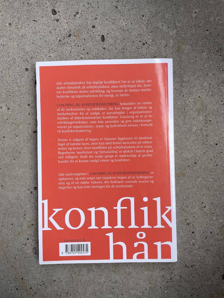 Bogen præsenterer en række mekanismer og redskaber, som ledere og medarbejdere kan anvende for at undgå, at samarbejdet hæmmes af uhensigtsmæssige konflikter. Coaching beskrives som et stærkt udviklingsværktøj på organisations-, team- og individniveau i arbejdet med konflikthåndtering. Konflikter er en naturlig del af alle arbejdspladser og kan både skabe dynamik og nye muligheder. Samtidig er grænsen mellem konstruktiv udfordring og energidrænende stridigheder hårfin. Ved at forstå konfliktens faser og have redskaber til at omforme uro til udvikling opnås et sundere og mere produktivt arbejdsmiljø. I denne fjerde udgave, skræddersyet til fagplanen for akademifaget Coaching og konflikthåndtering, er begreberne mediation og forhandling tydeligere adskilt, idet evnen til at genforhandle ofte er nødvendig for at undgå fastlåste tvister. Alle undersøgelser er opdateret, og bogen suppleres nu af en lydbog samt videoer, der belyser centrale teorier og begreber og styrker de studerendes læring.