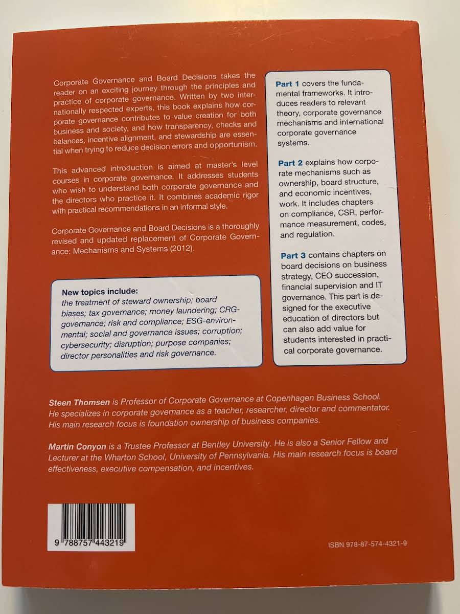 Corporate Governance and Board Decisions offers a comprehensive exploration of the fundamental principles and practices that shape effective corporate governance. Steen Thomsen guides the reader through the critical importance of transparency, balanced oversight, and incentive alignment in enhancing value creation for both businesses and society. The text fuses academic rigor with practical insights, making it especially suited for master’s level courses and professionals keen to deepen their understanding of board dynamics. This thoroughly revised and updated volume builds on previous editions to present a balanced discussion of theoretical frameworks and real-world applications. It examines topics such as compliance, performance measurement, corporate social responsibility, and the delicate interplay between board behavior and strategy, all of which are essential for reducing decision errors and curbing opportunism. Table of Contents Part 1. Introduction Chapter 1. What is corporate governance? Chapter 2. Theories of Corporate Governance Appendix: Optimal Contracts and Agency Problems Chapter 3. The Mechanisms of Governance Chapter 4. International Corporate Governance Chapter 5. Corporate Governance Codes and Regulations Part 2. Mechanisms Chapter 6. Compliance Chapter 7. Performance Measurement Chapter 8. Corporate Social Responsibility Chapter 9. Corporate Ownership Chapter 10. Board Theory and Board Structure Chapter 11. Board Behaviour Chapter 12. Executive Compensation Part 3. Board Decisions Chapter 13. The Board and Strategy Chapter 14. The Board and Succession Chapter 15. Supervision and Support Appendix: Value Creation Chapter 16. IT Governance