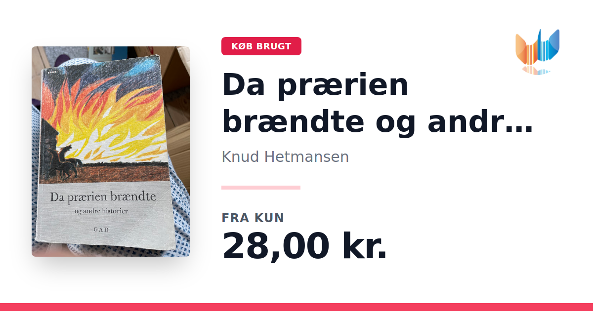 Lige nu kan du købe "Da prærien brændte og andre historier " af Knud Hetmansen til kun 28,00 kr. Bogen du ser her er brugt, og i slidt stand. Vi har i øjeblikket kun et enkelt eksemplar til salg af "Da prærien brændte og andre historier ", så slå til mens du kan!