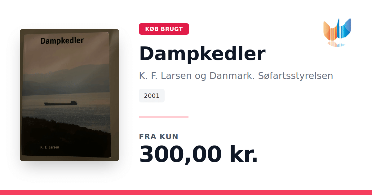 Lige nu kan du købe "Dampkedler" af K. F. Larsen og Danmark. Søfartsstyrelsen til kun 300,00 kr. Bogen du ser her er brugt, og i god stand. Vi har i øjeblikket 2 eksemplarer til salg af "Dampkedler", så husk at se de forskellige udgaver.