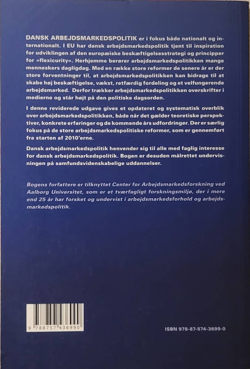 Dansk arbejdsmarkedspolitik er en central disciplin med betydning både i Danmark og internationalt. Denne opdaterede 2. udgave af bogen giver et systematisk overblik over emnet – fra de teoretiske perspektiver og praktiske erfaringer til de udfordringer, som arbejdsmarkedspolitikken står over for i de kommende år. Fokus er særligt rettet mod de store reformer, der er gennemført fra starten af 2010’erne, og som har sat deres præg på både den danske og den europæiske beskæftigelsesstrategi. Bogen henvender sig til alle med faglig interesse for dansk arbejdsmarkedspolitik og er desuden et værdifuldt redskab i undervisningen på samfundsvidenskabelige uddannelser. Med sine 161 sider og et solidt fundament i både teori og praksis, tilbyder denne 2. udgave en grundig og nuanceret gennemgang af, hvordan arbejdsmarkedspolitikken påvirker hverdagen for mange mennesker.