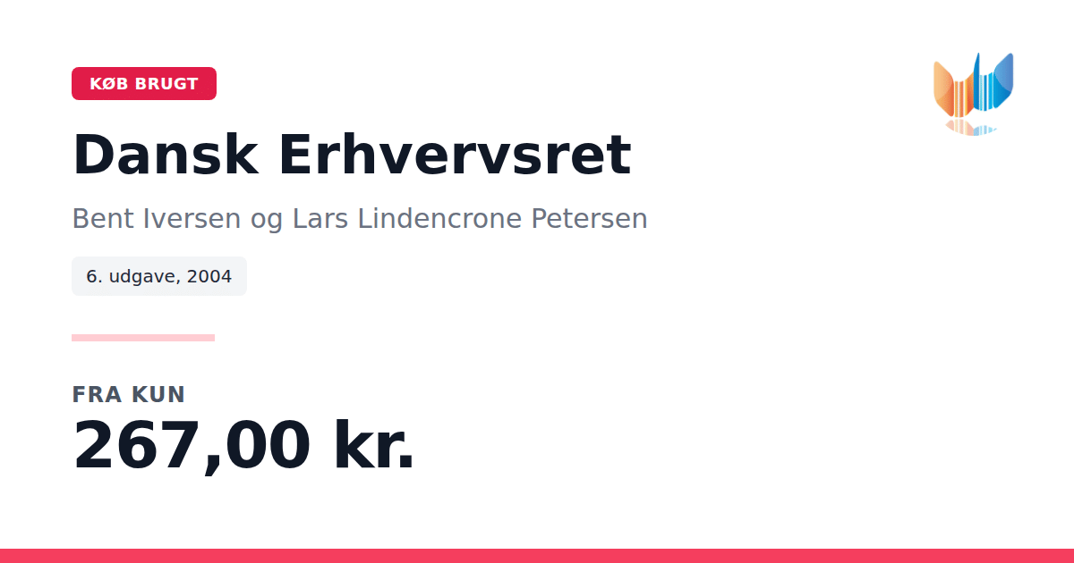 Lige nu kan du købe "Dansk Erhvervsret" af Bent Iversen og Lars Lindencrone Petersen til kun 267,00 kr. Du sparer hele 38% af nyprisen! Bogen du ser her er brugt, og i perfekt stand. Vi har i øjeblikket 3 eksemplarer til salg af "Dansk Erhvervsret", så husk at se de forskellige udgaver.