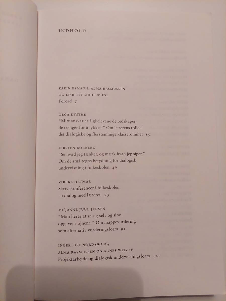 Bogen "Dansk i dialog" er primært rettet mod dansklærere og studerende, der beskæftiger sig med danskfaget. Forfattere: Bogen er skrevet af Karin Esman, Alma Rasmussen og Lisbeth Birde Wiese. Udgiver: Den er udgivet af Dansklærerforeningen, hvilket er angivet på forsiden af bogen. Formål: Bogen omhandler formentlig danskfaget og dialogisk læsning, som er en metode, hvor børn aktivt inddrages i læsningen.