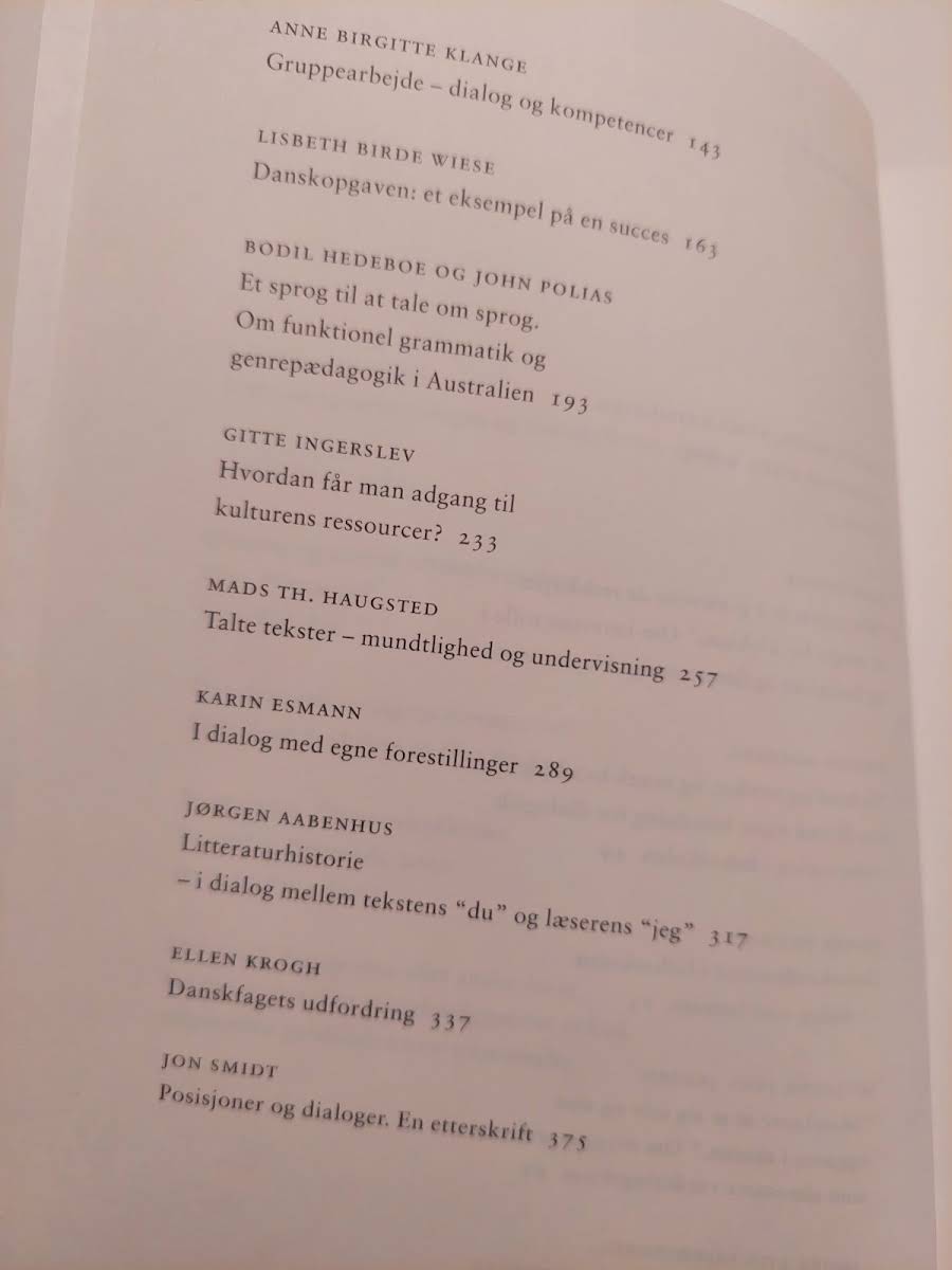 Bogen fremstår som ny og uden slid på omslag. Den har hverken overstregninger, noter eller æselører. Bogen tager udgangspunkt i en dialogisk tilgang til danskfaget og har tekster af bl.a. Olga Dysthe og Mads Th. Haugsted.