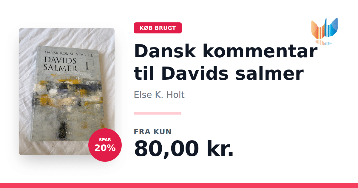 Lige nu kan du købe "Dansk kommentar til Davids salmer" af Else K. Holt til kun 80,00 kr. Du sparer hele 20% af nyprisen! Bogen du ser her er brugt, og i god stand. Vi har i øjeblikket 2 eksemplarer til salg af "Dansk kommentar til Davids salmer", så husk at se de forskellige udgaver.