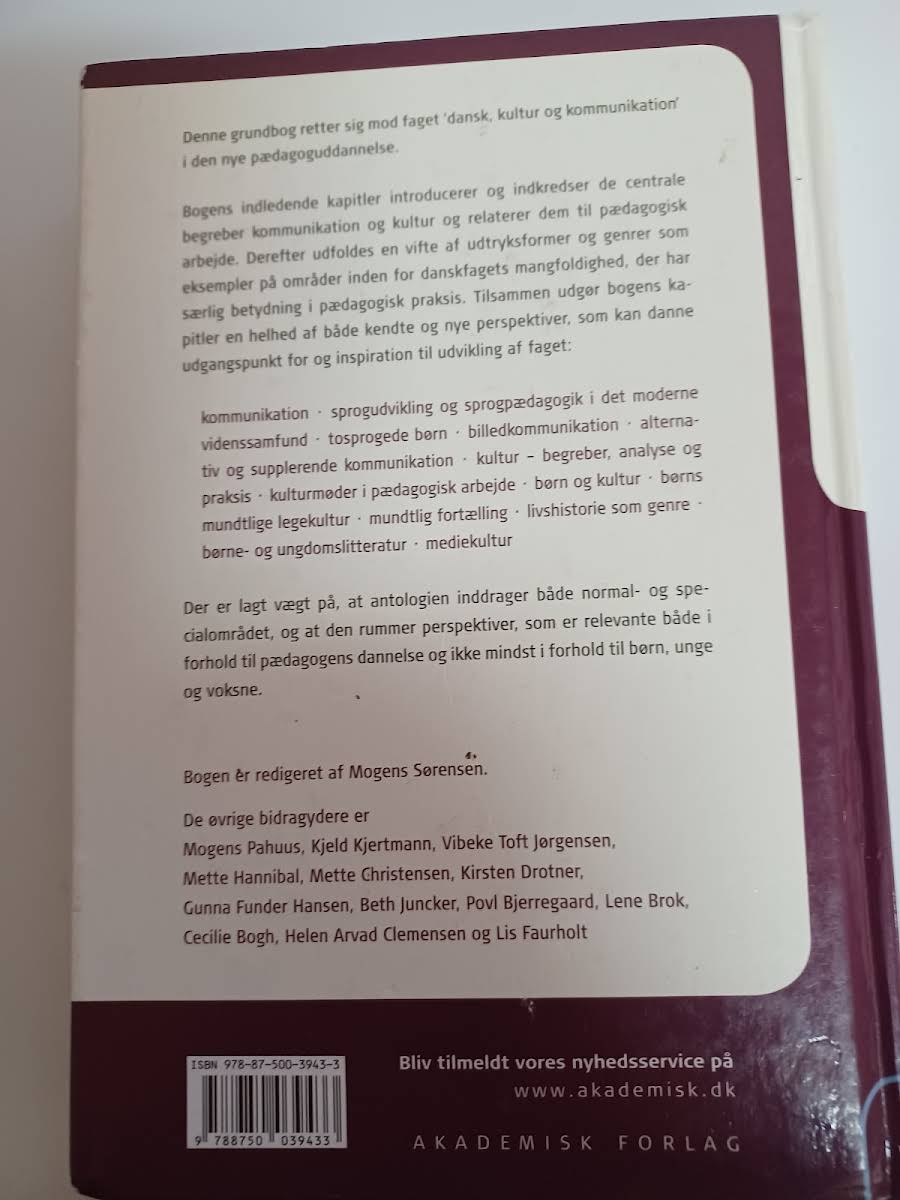 Dansk, kultur og kommunikation er en grundbog, der særligt henvender sig til faget dansk, kultur og kommunikation inden for den moderne pædagoguddannelse. Bogen samler et bredt udvalg af kapitler, som både præsenterer kendte og nye perspektiver, der tilsammen danner et solidt fundament for fagets videre udvikling. I bogen behandles centrale temaer såsom kommunikation, sprogudvikling og sprogpædagogik i det moderne videnssamfund. Læseren møder emner som to-sprogede børn, billedkommunikation samt alternativ og supplerende kommunikation. Desuden indgår der dybdegående diskussioner om kultur – herunder begrebsafklaring, analyse og praksis – samt møder mellem kultur og pædagogisk arbejde. Med sin brede tilgang, der inddrager både det almene og det specialiserede område, fungerer bogen som et inspirerende redskab til refleksion og videre udvikling af fagområdet.