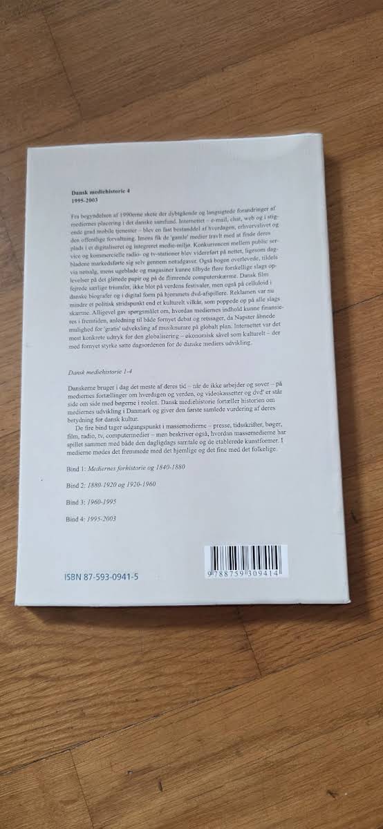 Denne bog, redigeret af Klaus Bruhn Jensen, giver en historisk gennemgang af de udviklinger, der har præget de danske medier i perioden 1995-2003. Udgivet af Samfundslitteratur i 2003 og i første udgave, præsenterer værket et solidt overblik over mediehistorien i en forandrende tid. Med sine 245 sider tilbyder "Dansk mediehistorie 1995-2003" læseren en nøje udvalgt samling af perspektiver, der afspejler den tidsrum, hvor medielandskabet undergik betydelige forandringer. Bogen henvender sig til alle, der ønsker at forstå de historiske processer bag udviklingen af danske medier i denne markante periode.