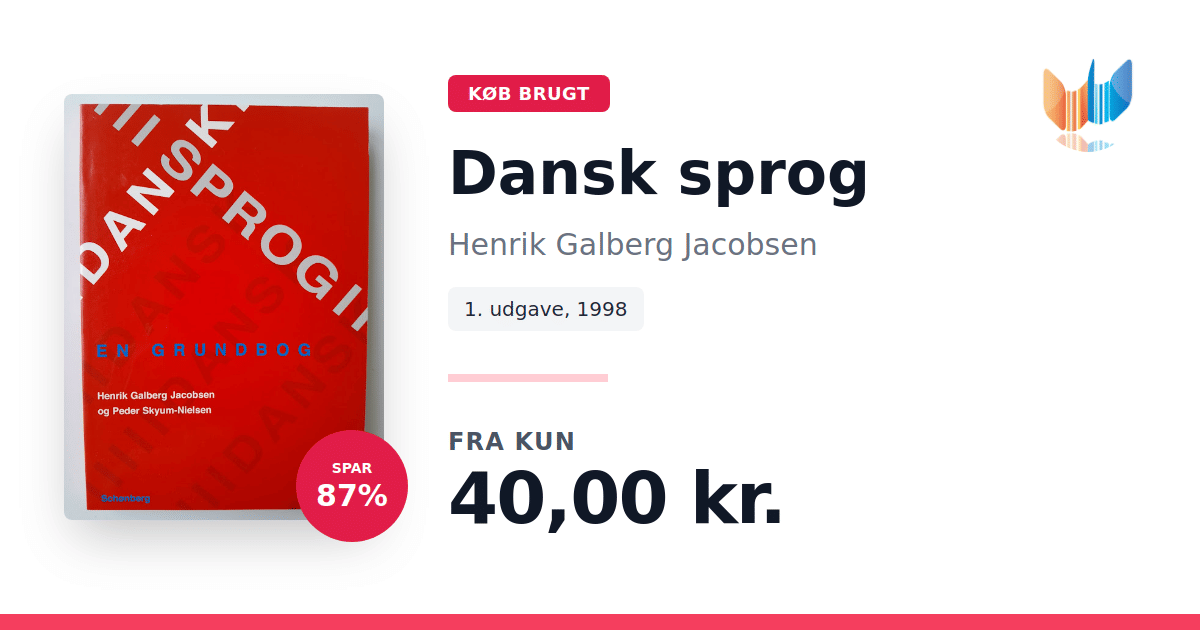Lige nu kan du købe "Dansk sprog" af Henrik Galberg Jacobsen til kun 40,00 kr. Du sparer hele 87% af nyprisen! Bogen du ser her er brugt, og i perfekt stand. Vi har i øjeblikket 4 eksemplarer til salg af "Dansk sprog", så husk at se de forskellige udgaver.