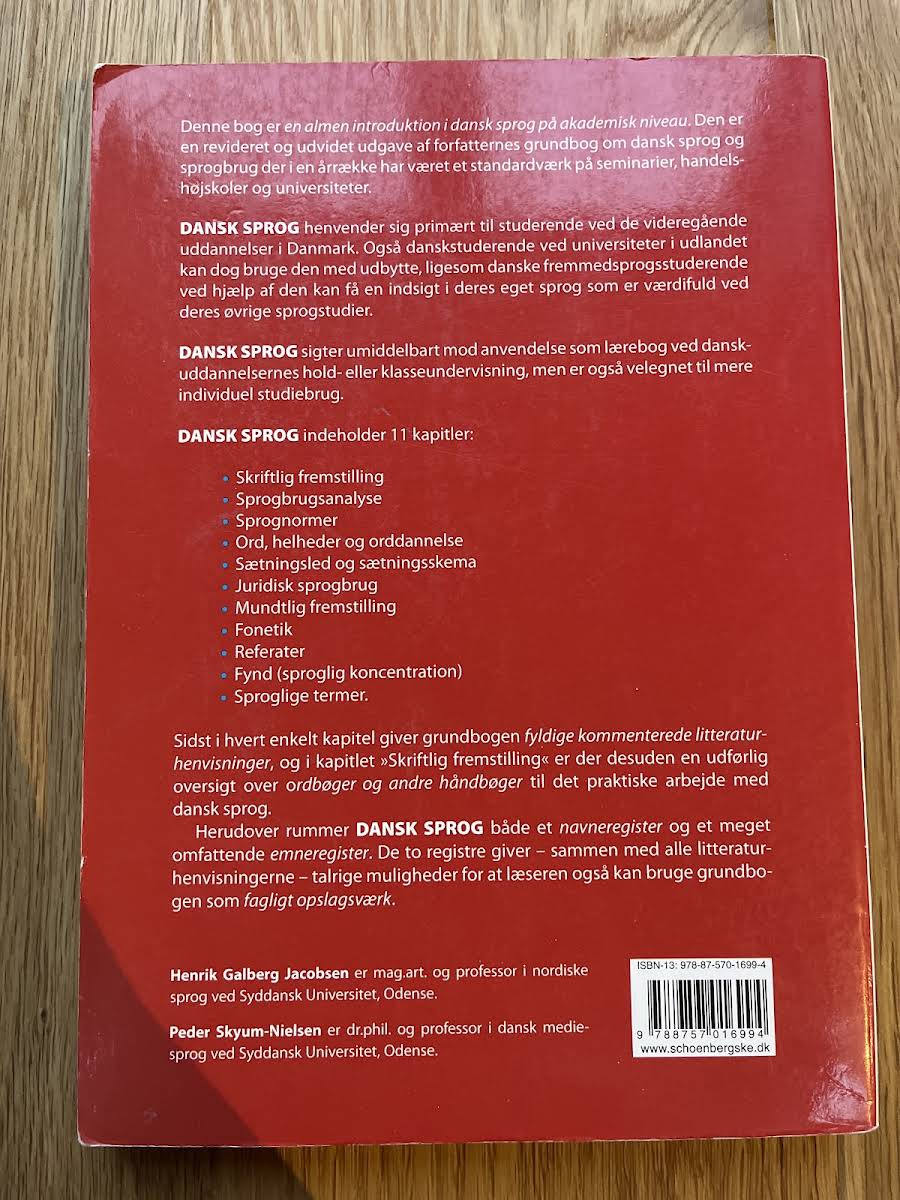 Dansk sprog giver en indsigtsfuld og velstruktureret introduktion til det danske sprogs verden. Ved at kombinere teoretiske perspektiver med praktiske eksempler tilbyder Peder Skyum-Nielsen og Henrik Galberg Jacobsen et værktøj, der hjælper studerende og andre interesserede med at få en dybere forståelse af sprogfænomener. Bogen formidler, hvordan sproget anvendes og udvikles, og den indbyder til refleksion over både normer og kreative afvigelser i dansk sprogbrug. Med sine 310 sider er Dansk sprog en grundlæggende ressource, der dykker ned i centrale emner og problemstillinger på et akademisk niveau. Udgivet af Hans Reitzels Forlag i 2007, rummer værket en række relevante indsigter og litteraturhenvisninger, som gør det værdifuldt både i undervisningssammenhæng og for det personlige studie.