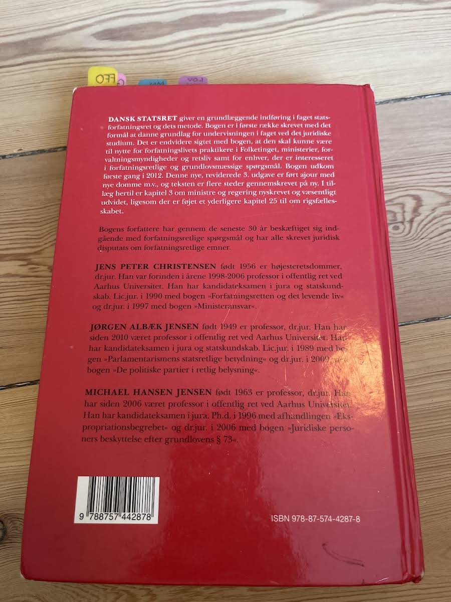 "Dansk Statsret" byder på en indsigtsfuld og grundig introduktion til faget statsforfatningsret, hvor både teoretiske og praktiske aspekter væves sammen for at give et solidt fundament for studerende og praktikere. Bogen er særligt udformet med henblik på at understøtte undervisningen på det juridiske studium, men appellerer også til dem, der arbejder med forfatningsretlige problemstillinger i offentlig forvaltning, retsvæsenet og politiske kredse. I denne reviderede tredje udgave, der følger op på den første udgivelse fra 2012, er teksten ajourført med nyere domme og kommenteret på flere centrale punkter. Kapitel om ministre og regering er blevet omarbejdet og udvidet, og et helt nyt kapitel om rigsfællesskabet er tilføjet, hvilket giver læseren en opdateret og nuanceret indsigt i det danske forfatningslandskab. Forfatterne, Jens Peter Christensen, Jørgen Albæk Jensen og Michael Hansen Jensen, har gennem over 30 år arbejdet intensivt med forfatningsretlige emner. Deres dybdegående erfaring og akademiske ekspertise gør "Dansk Statsret" til et essentielt redskab for alle, der ønsker en grundig forståelse af statens forfatningsmæssige rammer.