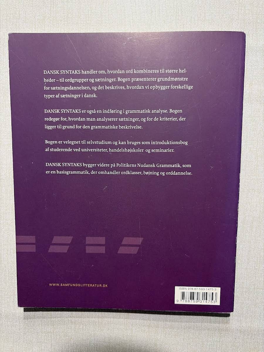 Dansk syntaks giver en solid introduktion til, hvordan ord struktureres og kombineres til meningsfulde ordgrupper og sætninger. I bogen forklares de grundlæggende principper bag dansk sætningsgrammatik, så du får et indblik i, hvordan sprogets opbygning fungerer fra det mindste led til komplekse sætningskonstruktioner. Christian Becker-Christensen præsenterer centrale mønstre for sætningsdannelsen og tilbyder et værktøj til grammatisk analyse, der understøtter din forståelse af det danske sprog. Denne lærebog henvender sig primært til studerende og alle, der har behov for at fordybe sig i sprogets struktur og regler.