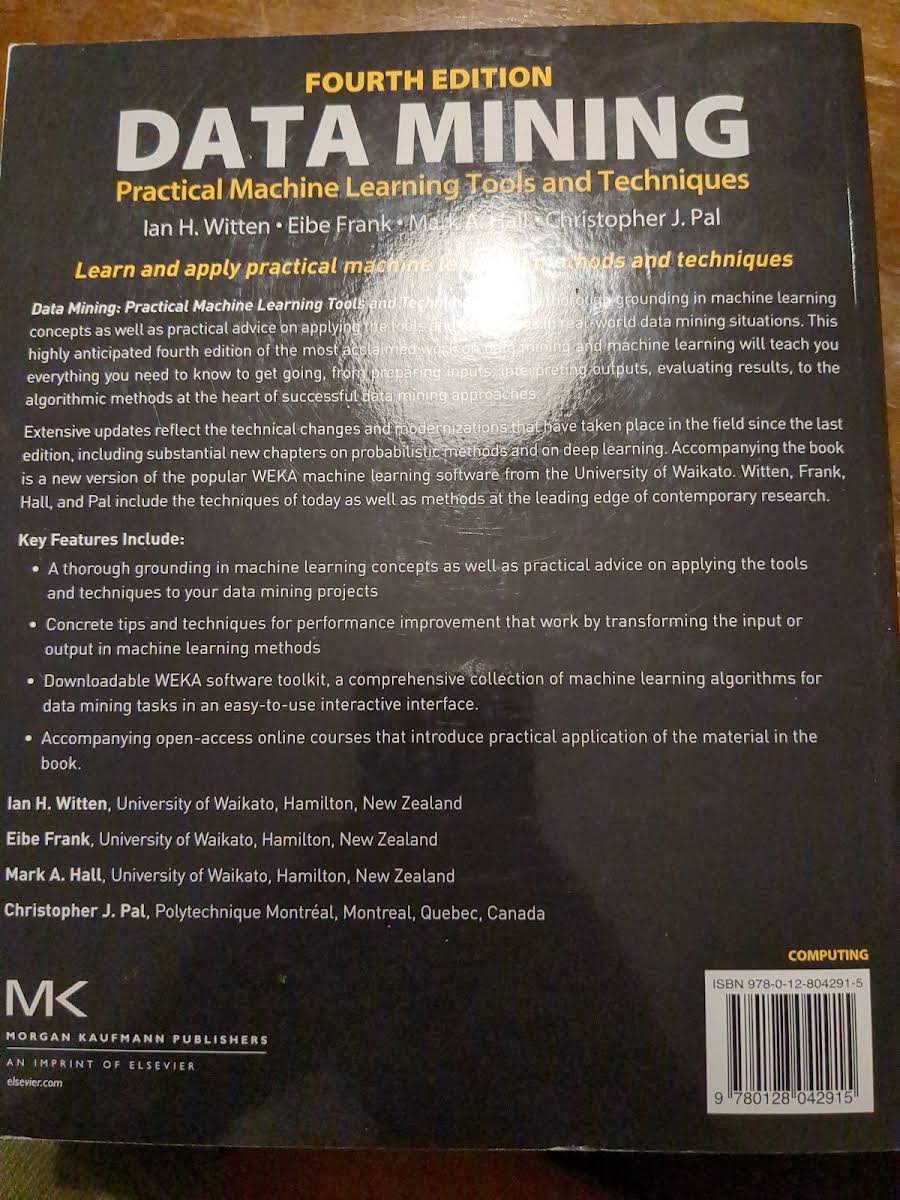 • Data Mining, Ian H. Witten, Eibe Frank, Mark A. Hall, Christopher J. Pal, 9780128042915