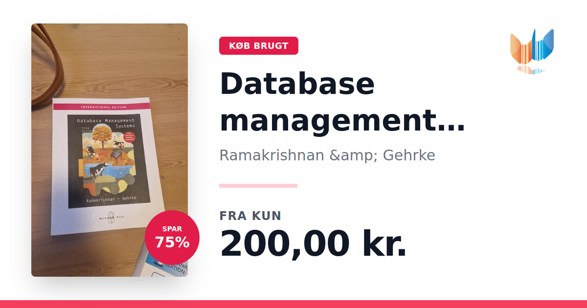 Lige nu kan du købe "Database management systems" af Ramakrishnan & Gehrke til kun 200,00 kr. Du sparer hele 75% af nyprisen! Bogen du ser her er brugt, og i god stand. Vi har i øjeblikket 3 eksemplarer til salg af "Database Management Systems", så husk at se de forskellige udgaver.