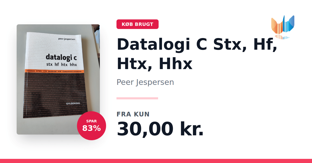 Lige nu kan du købe "Datalogi C Stx, Hf, Htx, Hhx" af Peer Jespersen til kun 30,00 kr. Du sparer hele 83% af nyprisen! Bogen du ser her er brugt, og i perfekt stand. Vi har i øjeblikket kun et enkelt eksemplar til salg af "Datalogi C Stx, Hf, Htx, Hhx", så slå til mens du kan!