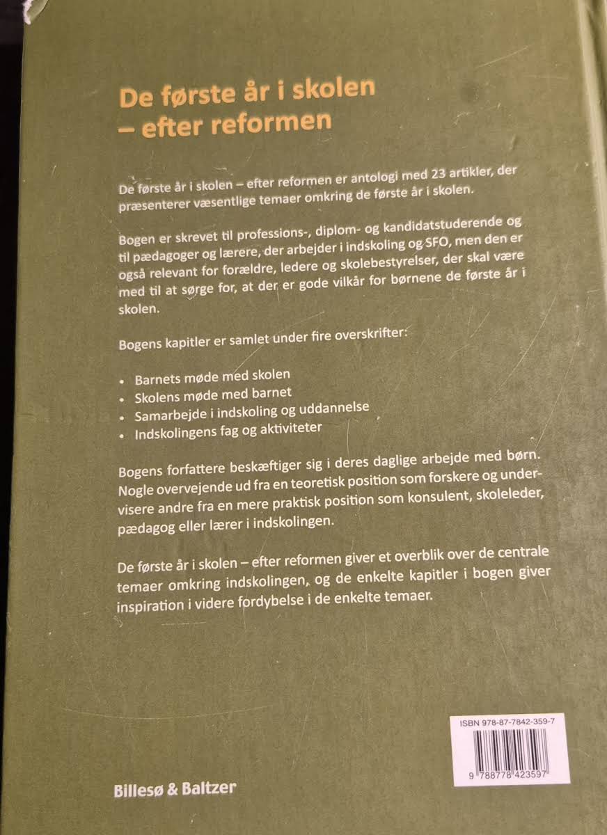 De første år i skolen efter reformen samler 23 artikler, der belyser de centrale temaer i indskolingen efter folkeskolereformen. Bidragene giver et nuanceret indblik i, hvordan børns første skoleår kan tilrettelægges, så det både udfordrer og inspirerer. Bogen henvender sig til professions-, diplom- og kandidatstuderende samt til pædagoger og lærere i indskoling og SFO. Derudover vil forældre, skoleledere og skolebestyrelsesmedlemmer finde praksisnær viden og konkrete anvisninger til at sikre gode læringsmiljøer. Artiklerne er struktureret i fire temaer: Barnets møde med skolen, skolens møde med barnet, samarbejde i indskoling og uddannelse samt indskolingens fag og aktiviteter. Den klare inddeling gør det let at navigere mellem både teoretiske perspektiver og praktiske tilgange. Forfatterne kombinerer teoretisk forskning med erfaring fra hverdagen som konsulenter, undervisere, skoleledere, pædagoger og lærere. De første år i skolen efter reformen fungerer som en grundig indføring og inspirationskilde til videre fordybelse i indskolingens mangfoldige udfordringer.