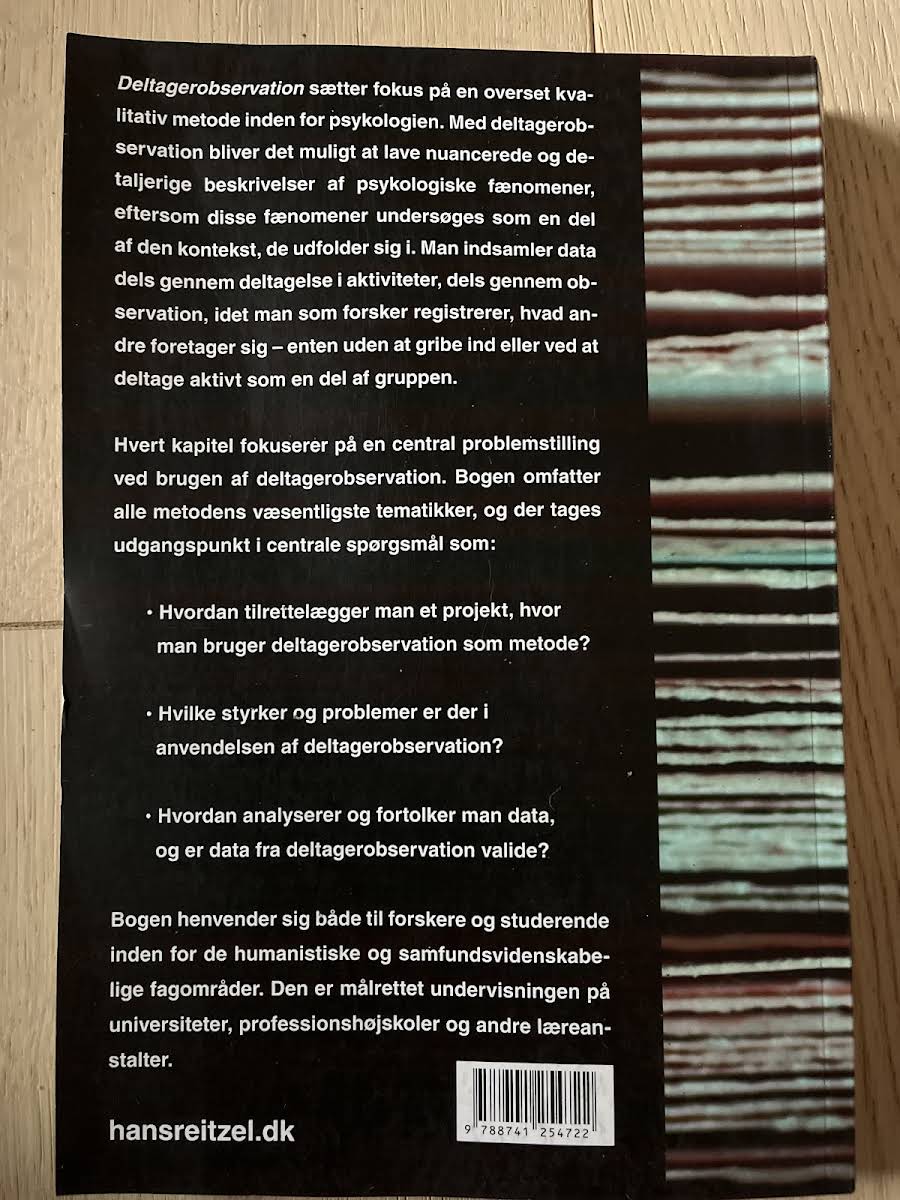 Deltagerobservation sætter fokus på en kvalitativ metode, der kan åbne nye perspektiver på psykologiske fænomener. Bogen giver en grundig redegørelse for, hvordan man både deltager og observerer samtidig med at indsamle data, så undersøgelsen fanger den kontekst, hvori adfærd og sociale interaktioner udfolder sig. Gennem en række velvalgte kapitler adresseres centrale spørgsmål omkring planlægning, gennemførelse og analyse af deltagerobservation. Hvad kræves af et solidt metodisk grundlag, og hvilke fordele og udfordringer kan møde forskeren undervejs? Denne samling af bidrag går i dybden med både teoretiske overvejelser og praktiske erfaringer. Bogen henvender sig til studerende og forskere inden for psykologi, humaniora, samfundsvidenskab og pædagogik, som ønsker at udvide deres metodiske repertoire. Med hendes nuancerede tilgang tilbyder Deltagerobservation et værdifuldt redskab til at forstå og dokumentere menneskelig interaktion i alle dens facetter.