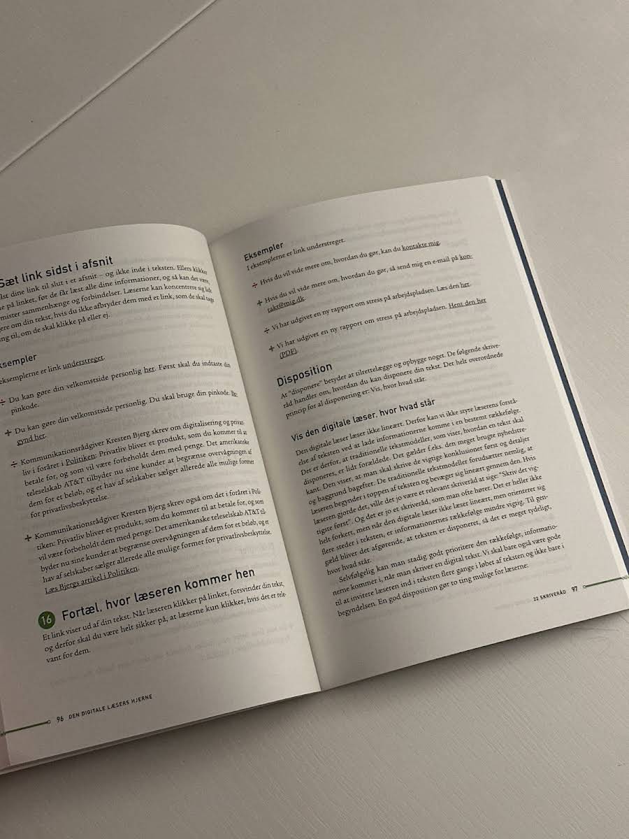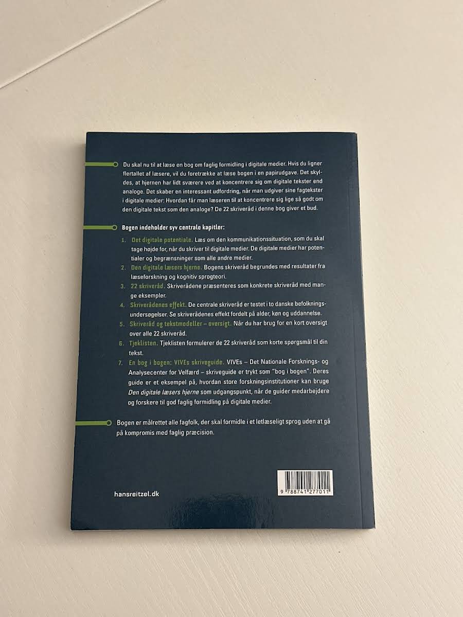 Den digitale læsers hjerne dykker ned i, hvordan vi bedst formidler fagligt indhold i digitale medier. For mange læsere er den trykte udgave en foretrukken oplevelse, da hjernen ofte har sværere ved at fokusere på digitale tekster. Denne bog sætter fokus på, hvordan man med 22 konkrete skriveråd skaber en tekst, der fanger læserens opmærksomhed – uanset om den læses på en skærm eller i papirformat. Bogen er inddelt i syv centrale kapitler, der hver især belyser forskellige sider af den digitale kommunikationssituation. I kapitlet "Det digitale potentiale" får du indsigt i, hvordan digitale medier både byder på muligheder og stiller krav til, hvordan vi kommunikerer. Herefter forklares i "Den digitale læsers hjerne", hvordan skriveanbefalingerne er forankret i resultater fra læseforskning og kognitiv sprogteori. I kapitlet "22 skriveråd" præsenteres rådene med mange illustrative eksempler, mens "Skriverådenes effekt" demonstrerer, hvordan rådene har vist sig effektive i to danske befolkningsundersøgelser. Yderligere byder bogen på kapitlerne "Skriveråd og tekstmodeller – oversigt" og "Tjeklisten", som hurtigt giver overblik og praktiske spørgsmål til din egen tekst. Afslutningsvis byder "En bog i bogen: VIVEs skriveguide" på et eksempel på, hvordan en stor forskningsinstitution formidler gode skriveprincipper til medarbejdere og forskere. Med sit fokus på at gøre faglig kommunikation mere tilgængelig og engagerende, er Den digitale læsers hjerne et vigtigt redskab for alle, der ønsker at styrke deres formidlingsevner i den digitale tidsalder.