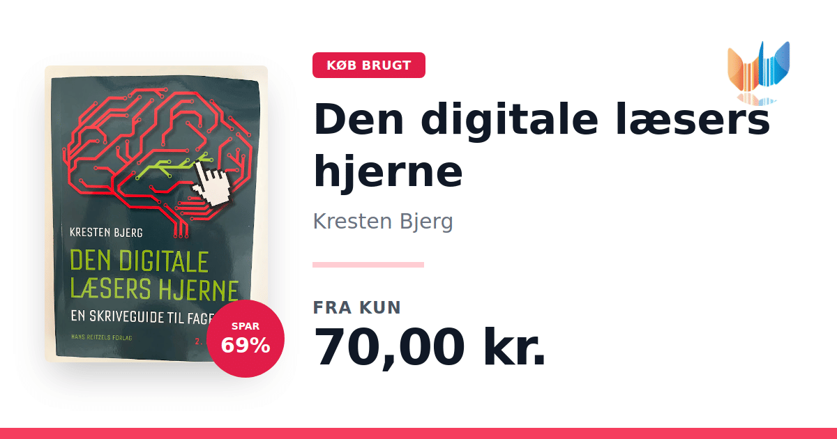 Lige nu kan du købe "Den digitale læsers hjerne" af Kresten Bjerg til kun 70,00 kr. Du sparer hele 69% af nyprisen! Bogen du ser her er brugt, og i perfekt stand. Vi har i øjeblikket 3 eksemplarer til salg af "Den digitale læsers hjerne", så husk at se de forskellige udgaver.