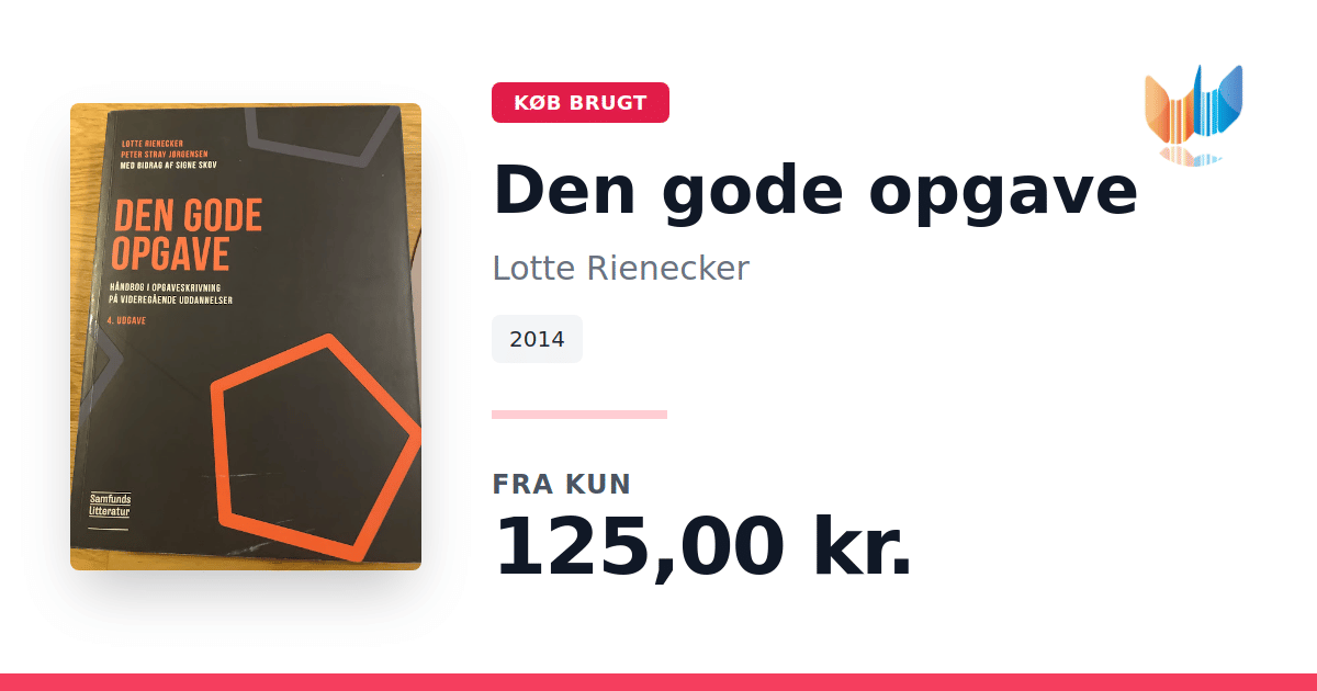 Lige nu kan du købe "Den gode opgave" af Lotte Rienecker til kun 125,00 kr. Bogen du ser her er brugt, og i god stand. Vi har i øjeblikket 44 eksemplarer til salg af "Den gode opgave", så husk at se de forskellige udgaver.