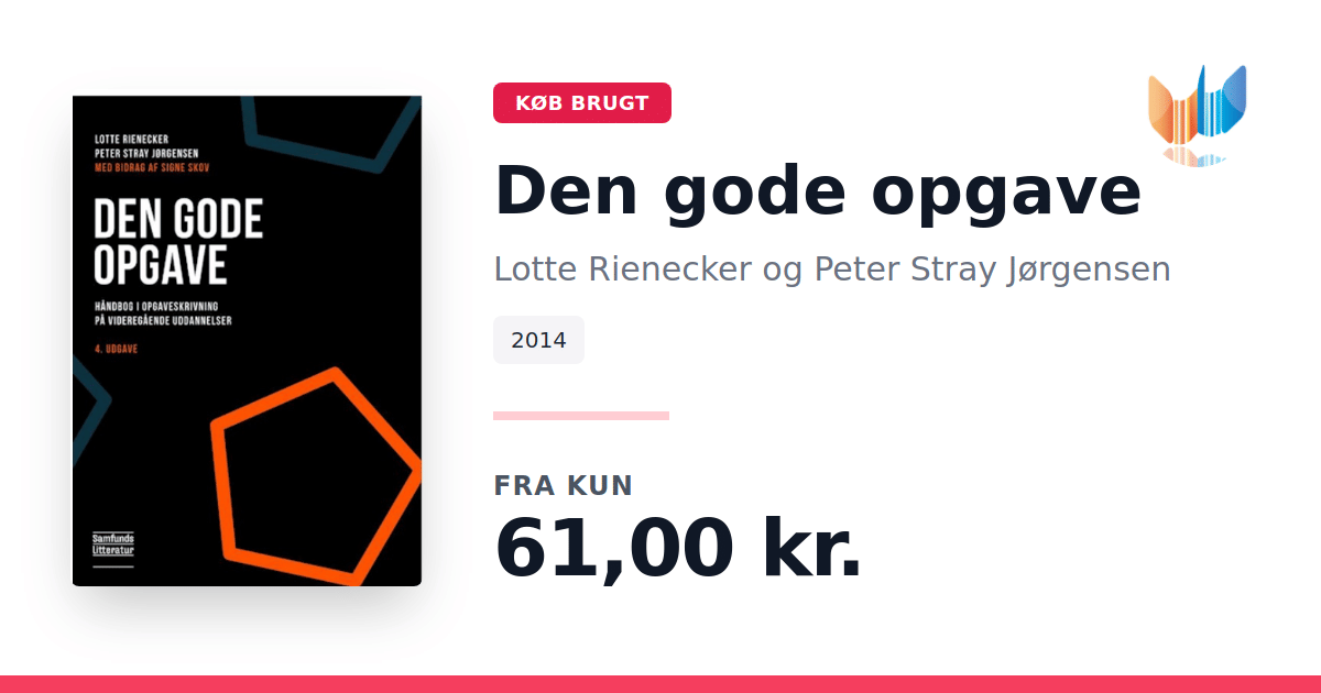 Lige nu kan du købe "Den gode opgave" af Lotte Rienecker og Peter Stray Jørgensen til kun 61,00 kr. Bogen du ser her er brugt, og i perfekt stand. Vi har i øjeblikket 41 eksemplarer til salg af "Den gode opgave", så husk at se de forskellige udgaver.