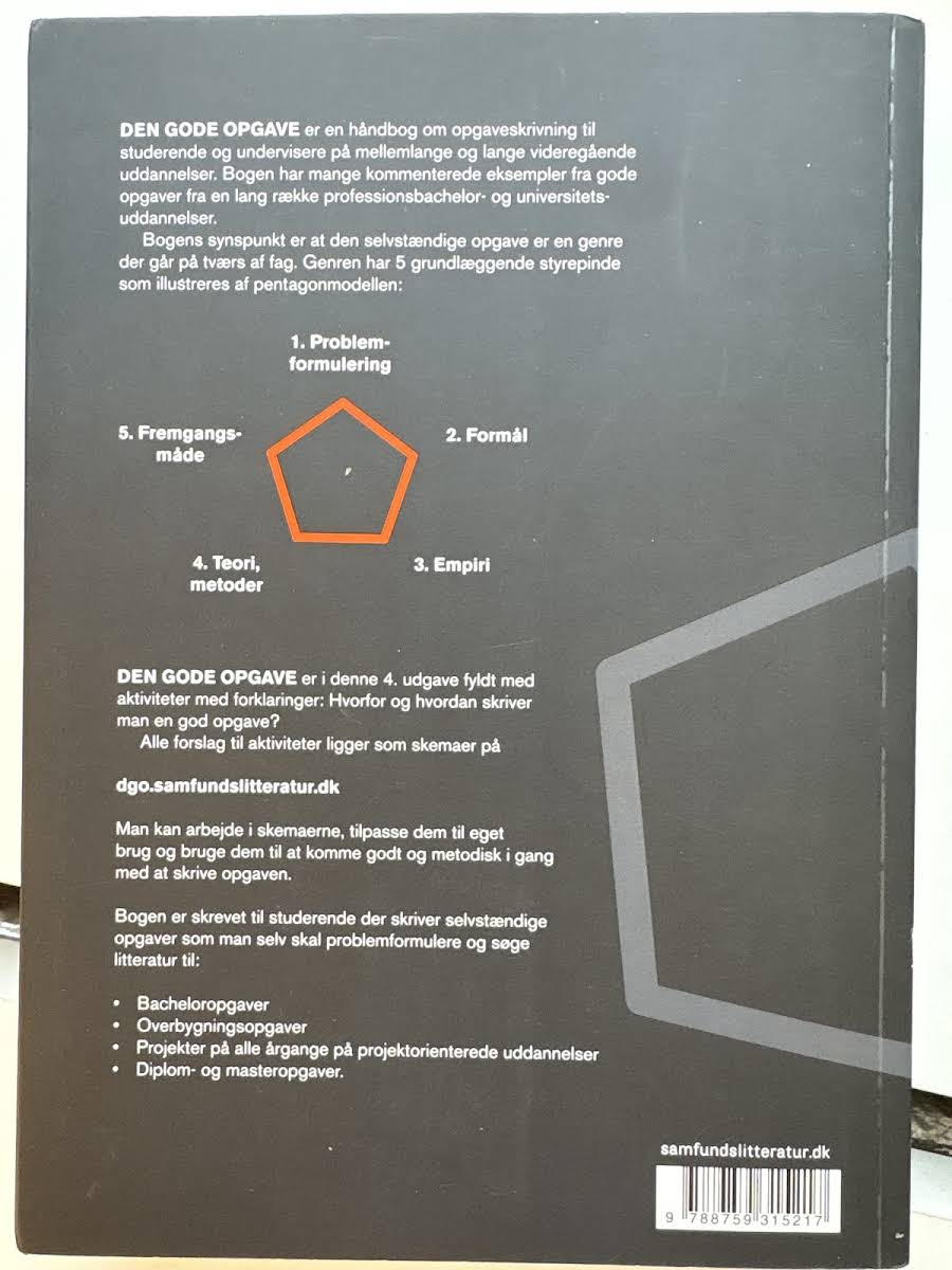 I mere end 15 år har studerende på tværs af fag og uddannelser anvendt Den gode opgave, den kendte håndbog i opgaveskrivning til studerende og undervisere på lange og mellemlange videregående uddannelser. Fra sygepleje- til seminariestuderende, fra idræt- til it-studerende, fra business- til biologistuderende. Bogen indeholder mere om metoder til litteratursøgning, om opgavers litteraturbaserede argumentation og flere aktiviteter og skemaer til litteratursøgning og vurdering.