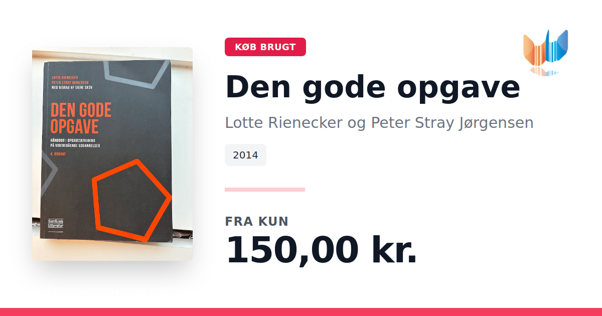 Lige nu kan du købe "Den gode opgave" af Lotte Rienecker og Peter Stray Jørgensen til kun 150,00 kr. Bogen du ser her er brugt, og i perfekt stand. Vi har i øjeblikket 42 eksemplarer til salg af "Den gode opgave", så husk at se de forskellige udgaver.