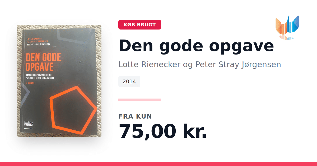 Lige nu kan du købe "Den gode opgave" af Lotte Rienecker og Peter Stray Jørgensen til kun 75,00 kr. Bogen du ser her er brugt, og i perfekt stand. Vi har i øjeblikket 44 eksemplarer til salg af "Den gode opgave", så husk at se de forskellige udgaver.