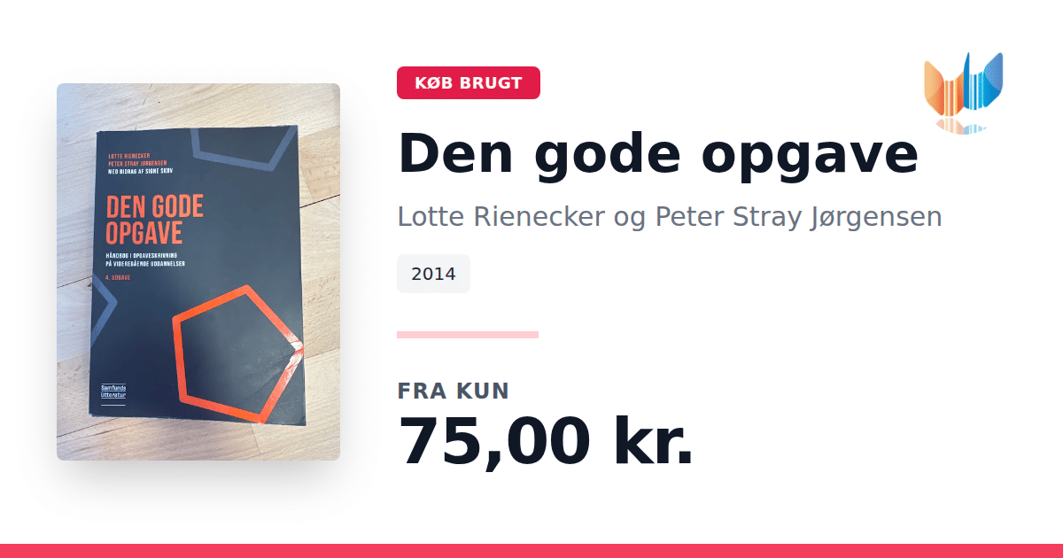 Lige nu kan du købe "Den gode opgave" af Lotte Rienecker og Peter Stray Jørgensen til kun 75,00 kr. Bogen du ser her er brugt, og i perfekt stand. Vi har i øjeblikket 44 eksemplarer til salg af "Den gode opgave", så husk at se de forskellige udgaver.
