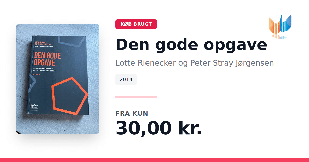 Lige nu kan du købe "Den gode opgave" af Lotte Rienecker og Peter Stray Jørgensen til kun 30,00 kr. Bogen du ser her er brugt, og i god stand. Vi har i øjeblikket 33 eksemplarer til salg af "Den gode opgave", så husk at se de forskellige udgaver.