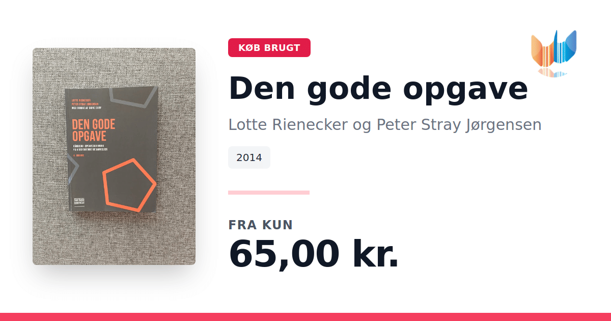 Lige nu kan du købe "Den gode opgave" af Lotte Rienecker og Peter Stray Jørgensen til kun 65,00 kr. Bogen du ser her er brugt, og i perfekt stand. Vi har i øjeblikket 42 eksemplarer til salg af "Den gode opgave", så husk at se de forskellige udgaver.