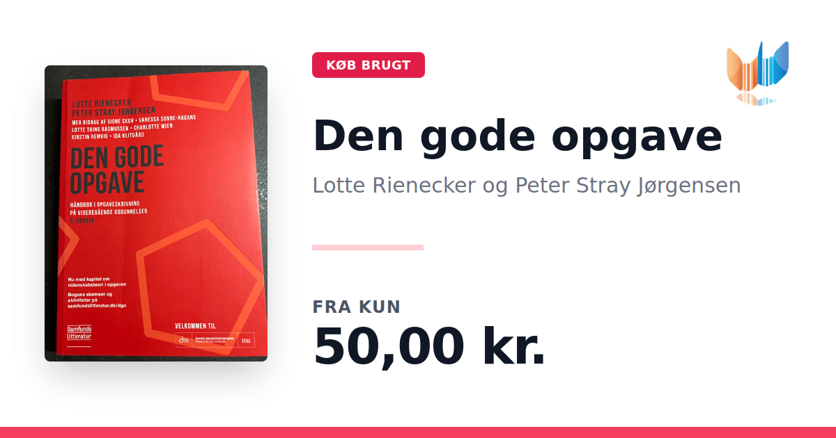Lige nu kan du købe "Den gode opgave" af Lotte Rienecker og Peter Stray Jørgensen til kun 50,00 kr. Bogen du ser her er brugt, og i perfekt stand. Vi har i øjeblikket 41 eksemplarer til salg af "Den gode opgave", så husk at se de forskellige udgaver.