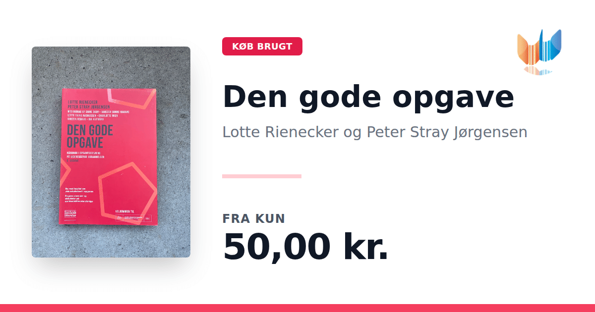 Lige nu kan du købe "Den gode opgave" af Lotte Rienecker og Peter Stray Jørgensen til kun 50,00 kr. Bogen du ser her er brugt, og i perfekt stand. Vi har i øjeblikket 33 eksemplarer til salg af "Den gode opgave", så husk at se de forskellige udgaver.
