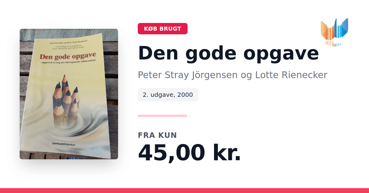 Lige nu kan du købe "Den gode opgave" af Peter Stray Jörgensen og Lotte Rienecker til kun 45,00 kr. Bogen du ser her er brugt, og i perfekt stand. Vi har i øjeblikket 42 eksemplarer til salg af "Den gode opgave", så husk at se de forskellige udgaver.