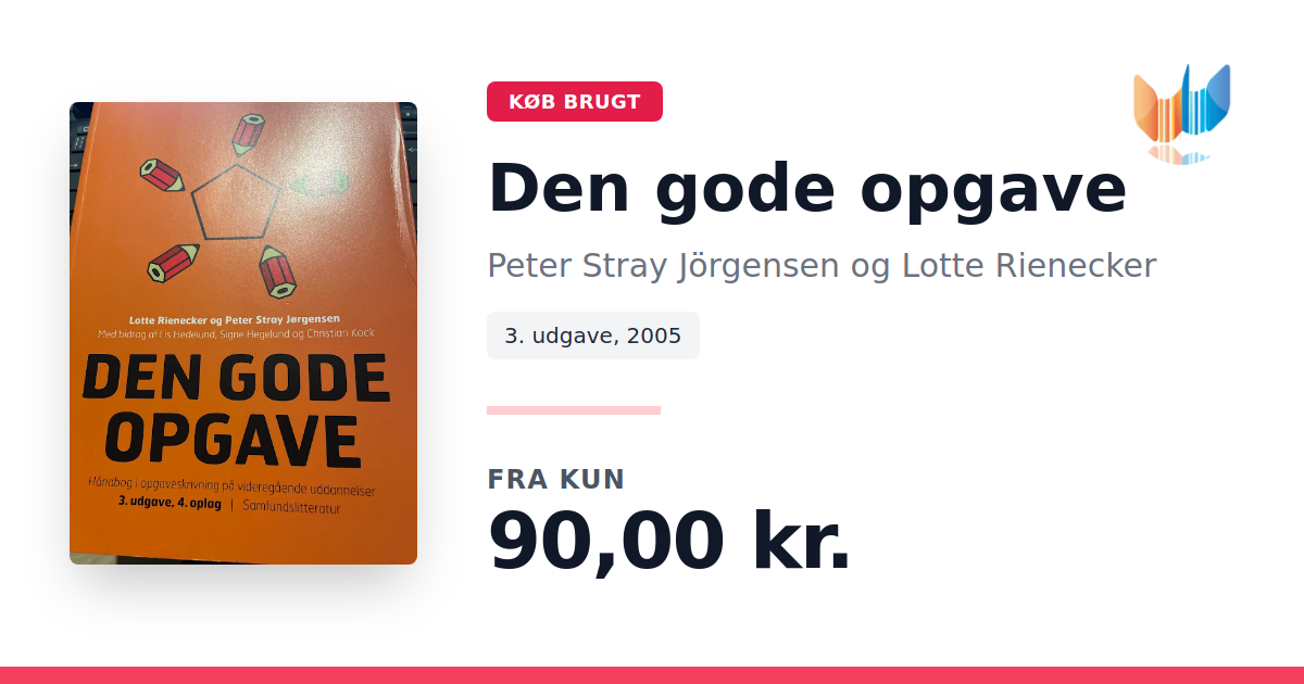 Lige nu kan du købe "Den gode opgave" af Peter Stray Jörgensen og Lotte Rienecker til kun 90,00 kr. Bogen du ser her er brugt, og i perfekt stand. Vi har i øjeblikket 23 eksemplarer til salg af "Den gode opgave", så husk at se de forskellige udgaver.