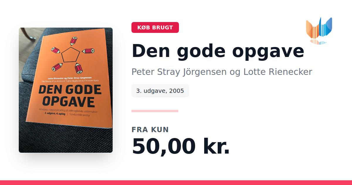 Lige nu kan du købe "Den gode opgave" af Peter Stray Jörgensen og Lotte Rienecker til kun 50,00 kr. Bogen du ser her er brugt, og i perfekt stand. Vi har i øjeblikket 45 eksemplarer til salg af "Den gode opgave", så husk at se de forskellige udgaver.