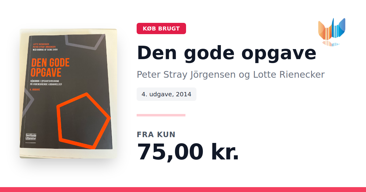 Lige nu kan du købe "Den gode opgave" af Peter Stray Jörgensen og Lotte Rienecker til kun 75,00 kr. Bogen du ser her er brugt, og i perfekt stand. Vi har i øjeblikket 32 eksemplarer til salg af "Den gode opgave", så husk at se de forskellige udgaver.