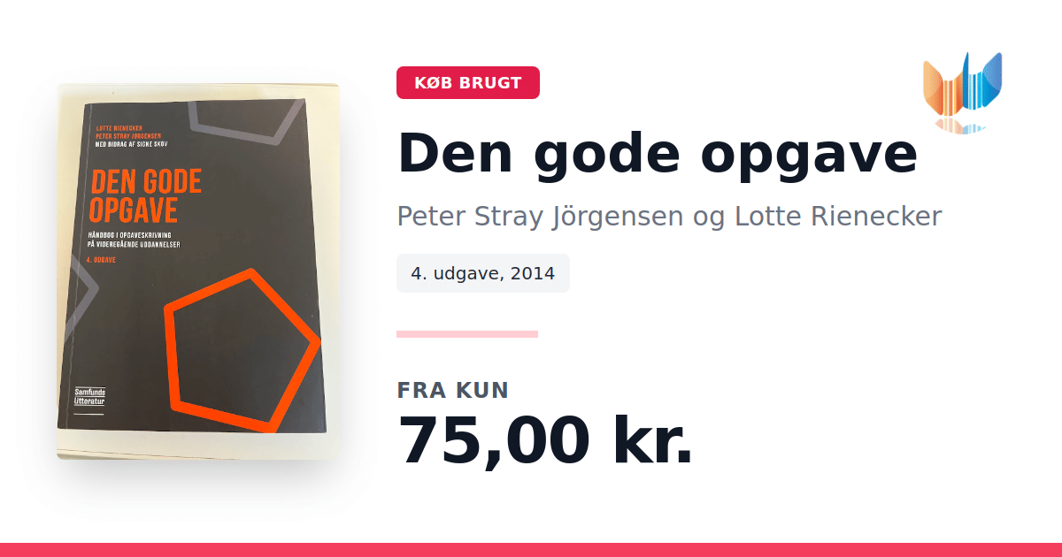 Lige nu kan du købe "Den gode opgave" af Peter Stray Jörgensen og Lotte Rienecker til kun 75,00 kr. Bogen du ser her er brugt, og i perfekt stand. Vi har i øjeblikket 45 eksemplarer til salg af "Den gode opgave", så husk at se de forskellige udgaver.