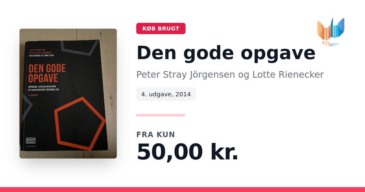Lige nu kan du købe "Den gode opgave" af Peter Stray Jörgensen og Lotte Rienecker til kun 50,00 kr. Bogen du ser her er brugt, og i god stand. Vi har i øjeblikket 40 eksemplarer til salg af "Den gode opgave", så husk at se de forskellige udgaver.