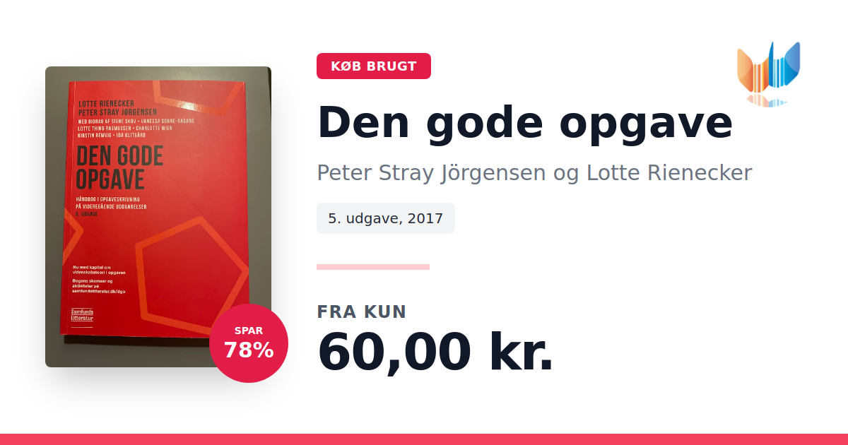 "Den gode opgave" udkommer nu i 5. udgave og er den ubestridte guide for alle studerende, der skal skrive selvstændige og videnskabelige opgaver. I denne udgave har Peter Stray Jörgensen og Lotte Rienecker fået selskab af fem nye medforfattere, som bidrager med deres unikke ekspertise. 5. udgave byder på to nye kapitler – et om videnskabsteori, der belyser, hvordan man omsætter teoretiske overvejelser til praksis, samt et kapitel om litteratur- og informationssøgning, som introducerer de studerende til processen bag en systematisk research. Bogen er fortsat fyldt med konkrete eksempler og aktiviteter, der hjælper den studerende godt på vej i opgaveskrivningen, og har i over 20 år dannet grundlaget for succesfuld akademisk skrivning.