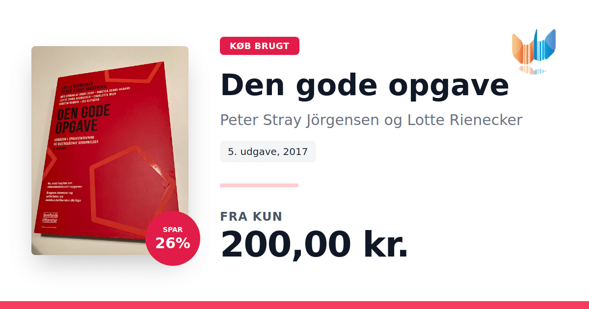"Den gode opgave" udkommer nu i 5. udgave og er den ubestridte guide for alle studerende, der skal skrive selvstændige og videnskabelige opgaver. I denne udgave har Peter Stray Jörgensen og Lotte Rienecker fået selskab af fem nye medforfattere, som bidrager med deres unikke ekspertise. 5. udgave byder på to nye kapitler – et om videnskabsteori, der belyser, hvordan man omsætter teoretiske overvejelser til praksis, samt et kapitel om litteratur- og informationssøgning, som introducerer de studerende til processen bag en systematisk research. Bogen er fortsat fyldt med konkrete eksempler og aktiviteter, der hjælper den studerende godt på vej i opgaveskrivningen, og har i over 20 år dannet grundlaget for succesfuld akademisk skrivning.