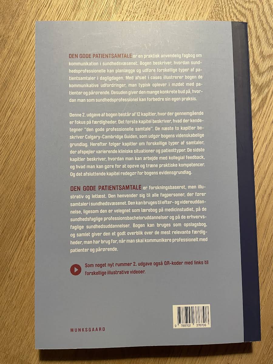Hvordan planlægger og gennemfører sundhedsprofessionelle effektive samtaler med patienter og pårørende i et travlt klinisk miljø? I denne 2. udgave anvendes autentiske cases til at belyse de kommunikative udfordringer, man typisk møder, og der præsenteres konkrete forslag til, hvordan man kan styrke sin egen praksis. Bogen henvender sig bredt til alle fagpersoner, der fører samtaler i sundhedsvæsenet. Den fungerer både som lærebog på medicinstudiet, de sundhedsprofessionelle professionsbacheloruddannelser og erhvervsfaglige sundhedsuddannelser, samt som et praktisk redskab til efter- og videreuddannelse. Strukturen er klart opbygget om færdigheder: Først introduceres Calgary-Cambridge-Guiden, som udgør bogens videnskabelige fundament. Herefter følger kapitler, der gennemgår forskellige samtaletyper under skiftende kliniske forløb og patientprofiler. De afsluttende kapitler viser, hvordan man kan træne sine samtalekompetencer og anvende kollegial feedback, mens bogens sidste afsnit dokumenterer evidensgrundlaget for de beskrevne metoder. Den samlede tilgang giver et solidt overblik over de mest relevante værktøjer til professionel kommunikation i sundhedsvæsenet.