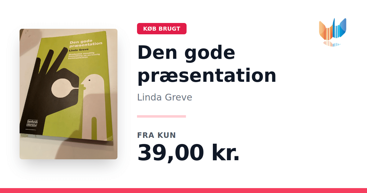 Lige nu kan du købe "Den gode præsentation" af Linda Greve til kun 39,00 kr. Bogen du ser her er brugt, og i perfekt stand. Vi har i øjeblikket kun et enkelt eksemplar til salg af "Den gode præsentation", så slå til mens du kan!
