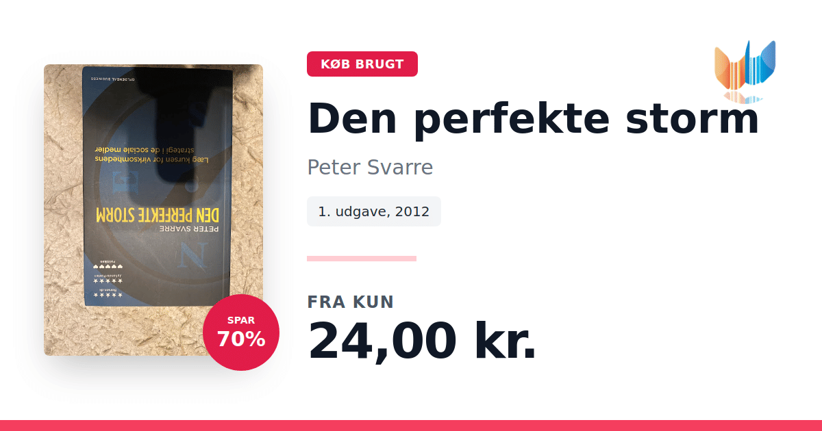 Lige nu kan du købe "Den perfekte storm" af Peter Svarre til kun 24,00 kr. Du sparer hele 70% af nyprisen! Bogen du ser her er brugt, og i perfekt stand. Vi har i øjeblikket kun et enkelt eksemplar til salg af "Den perfekte storm", så slå til mens du kan!