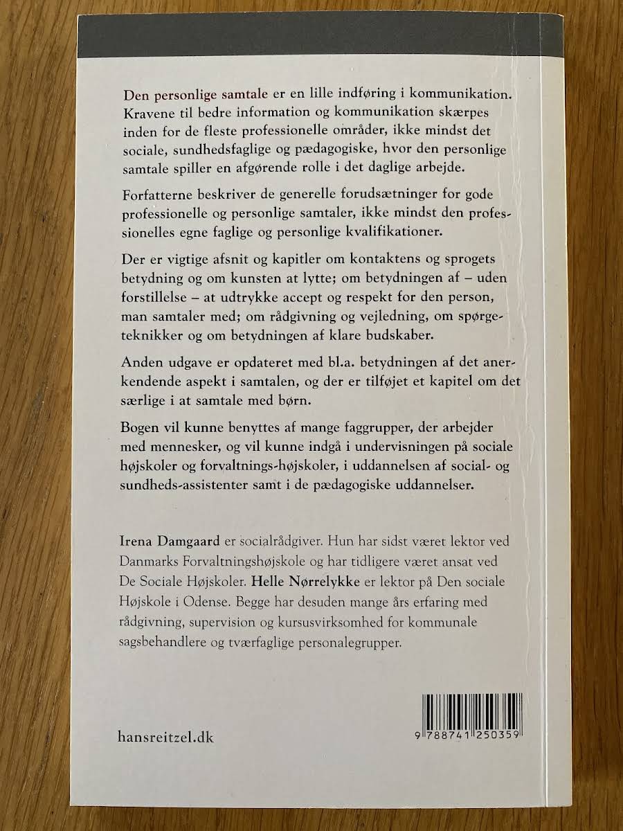 Denne 2. udgave tilbyder en opdateret og forfinet tilgang til den personlige samtale med fokus på anerkendende kommunikation. Forfatterne Irena Damgaard og Helle Nørrelykke fremhæver vigtigheden af ægte dialog og tilføjer et særligt kapitel, der belyser det unikke ved at tale med børn. Bogen giver en kortfattet introduktion til, hvordan man skaber meningsfuld kontakt i både professionelle og personlige samtaler. Den understreger de kommunikationsmæssige forudsætninger, såsom aktiv lytning, tydelig udtryksevne og brugen af klare budskaber, som er afgørende inden for bl.a. sociale, sundheds- og pædagogiske arbejdsområder. Med fokus på de grundlæggende elementer i god samtale, er denne udgave et værdifuldt redskab for alle faggrupper, der arbejder med mennesker, og kan bidrage positivt til undervisning og professionel udvikling.