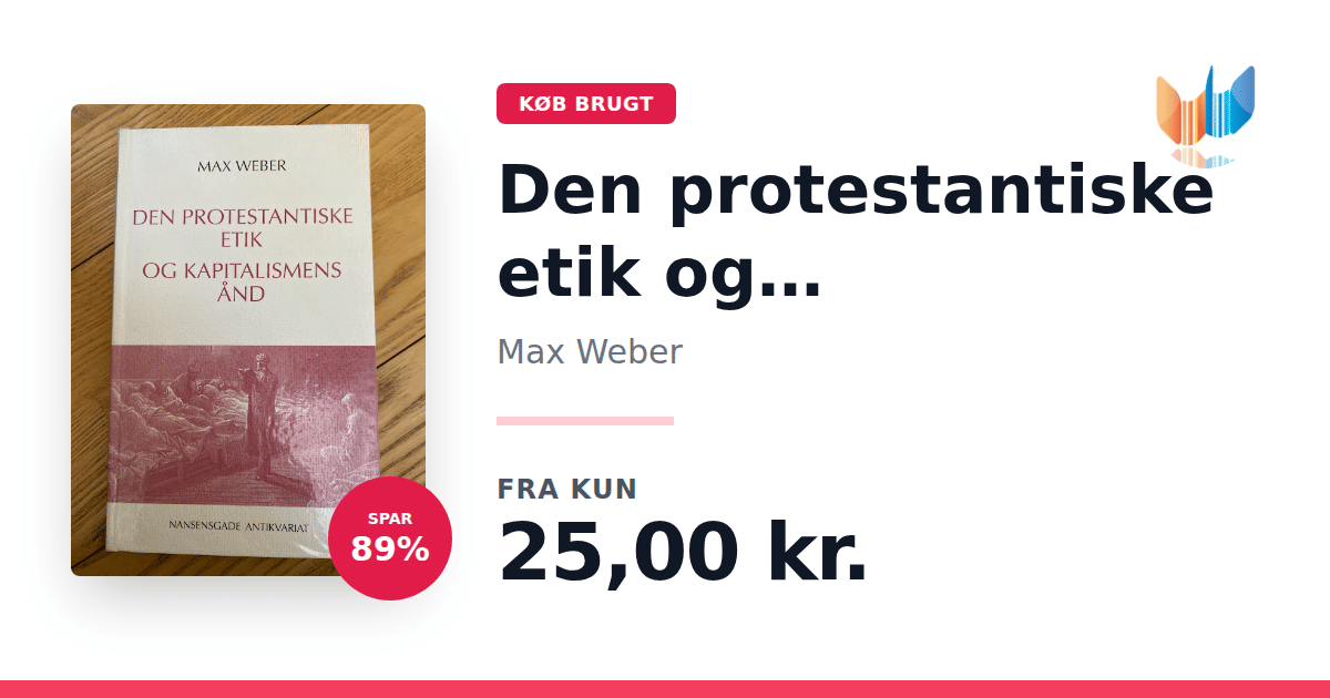 Lige nu kan du købe "Den protestantiske etik og kapitalismens ånd" af Max Weber til kun 25,00 kr. Du sparer hele 89% af nyprisen! Bogen du ser her er brugt, og i perfekt stand. Vi har i øjeblikket kun et enkelt eksemplar til salg af "Den protestantiske etik og kapitalismens ånd", så slå til mens du kan!